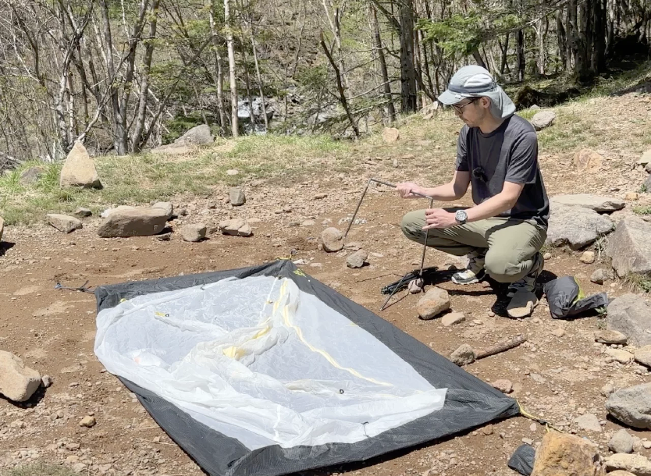 タニ オズモ1Pを設営する方法は、まず本体の四隅を地面に固定します。その後四隅にポールの先端をセットしたら吊り下げていきます。吊り下げが完了したらその上からフライシートをかけます。
