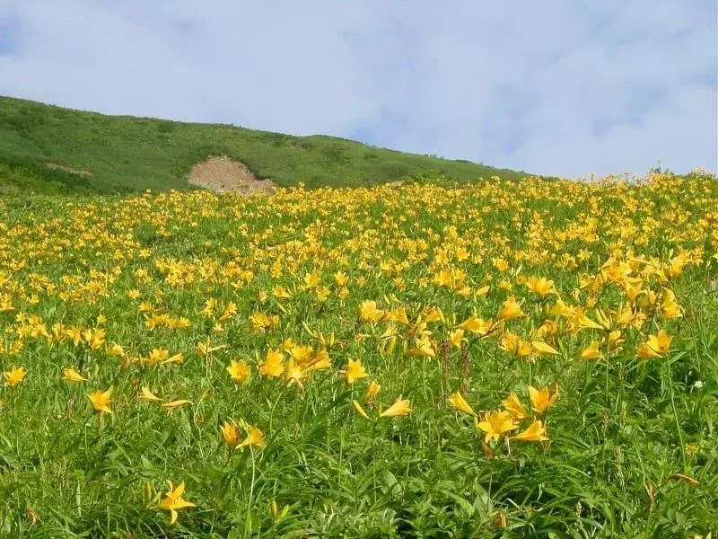 このルートはニッコウキスゲの群落地帯で、7月中旬にもなれば斜面一帯に黄色の花が咲き乱れる夢のような景色を見ることができます。またウスユキソウ、ハクサンフウロ、シナノキンバイ、ヒメシジャンなども咲いていてまさにお花畑。
