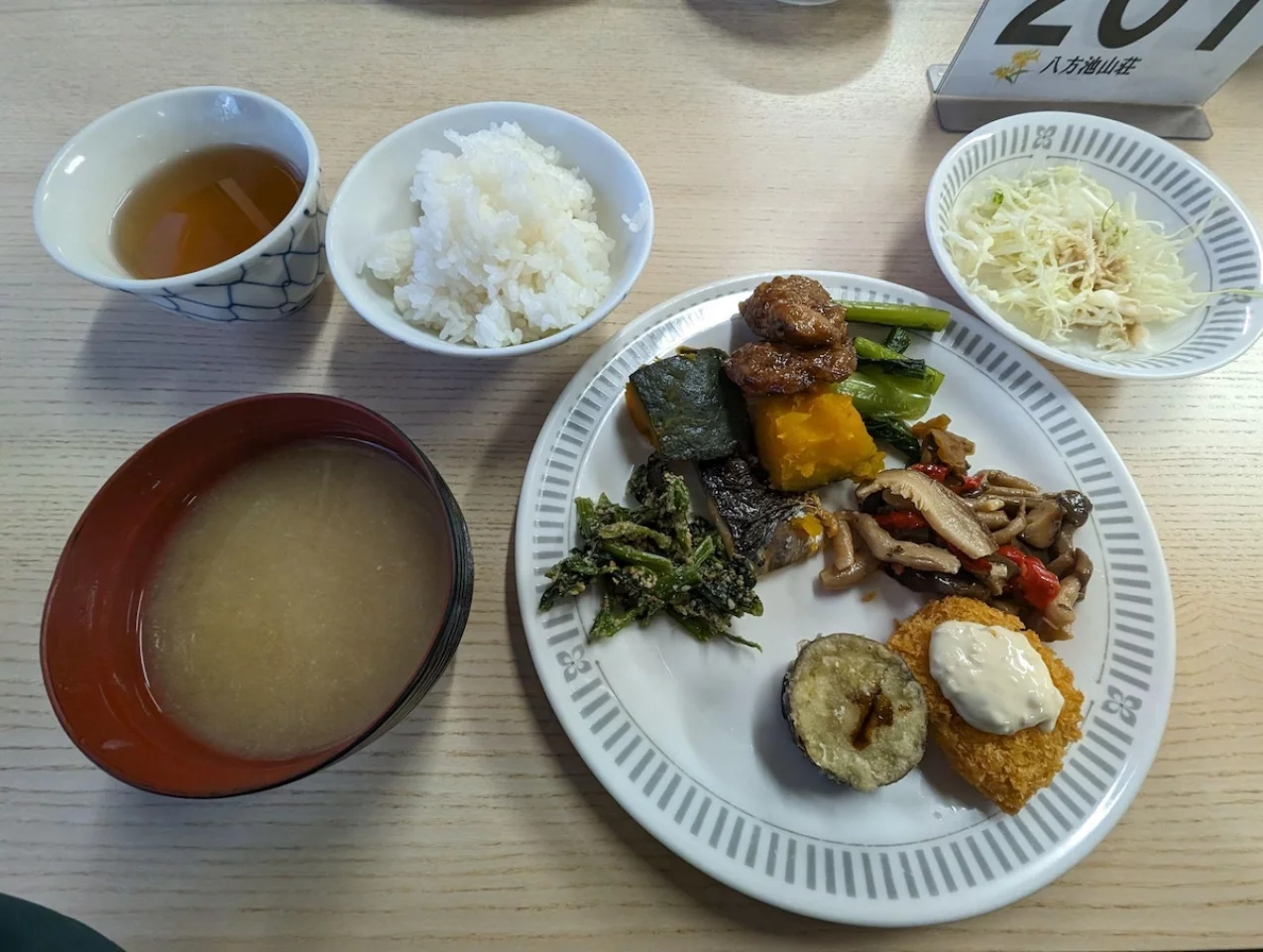 お待ちかねの夕食タイム。一時はコロナで中止されていたようですが、この日はバイキング形式でおかわり自由でした。自分に必要な分だけ食べれるのが良いですね。野菜や揚げ物も多く、どれも大変美味しかったです。