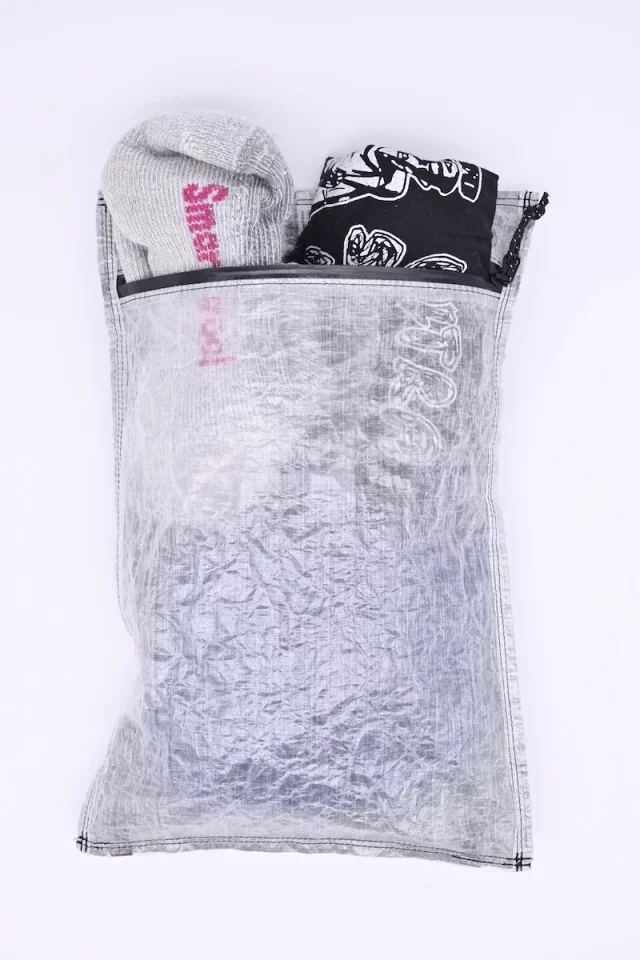 頭に当たる部分をスタッフバッグの内側に来るように裏返して、中に濡らしたくない着替えなどを入れておけば、完全防水ではないですが雨や汗で中のものを濡れから防ぐことができます。
