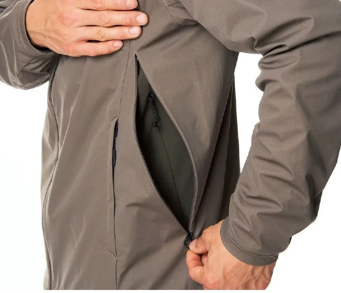 ヘルメットに対応したフードや、ハンドポケットをハーネスに干渉しない場所に配置、2wayのフロントファスナーなど、細部にアルパインクライミングに適した機能を散りばめています。