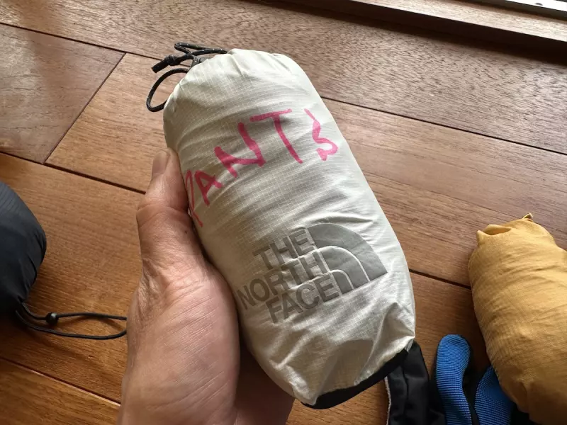 レインパンツはノースフェイスのストライクトレイルパンツをセレクトしました。10デニールの3層構造で重量は約125gです。シューズを履いたままでも裾に取り付けられたスナップボタンを開口して履くことができて便利です。ストレッチしない素材なので歩いたり走ったりしてると裾がめくれて靴下が濡れてしまうのが気になるポイントです。