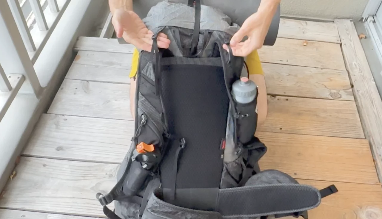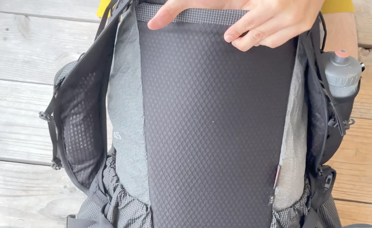 背面にはメッシュパネルが備わっており通気性を確保しています。背面の内側に2本のアルミニウム製フレームと背面パッドが搭載されており、多くの荷物を収納してもザックが崩れしない特徴があります。このフレームも背面パッドも取り外しして省略することでザックの軽量化を行うことができます。