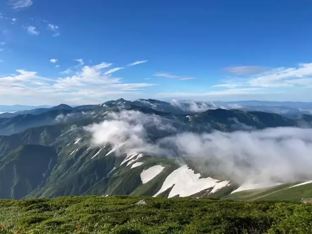 以東岳山頂から見る景色は全方位の大パノラマ。ほぼ同じ高さの山並みが連なって、大朝日岳へ続くたおやかな稜線を見れば、誰でもがいつかは朝日連峰の縦走を夢見ることでしょう。