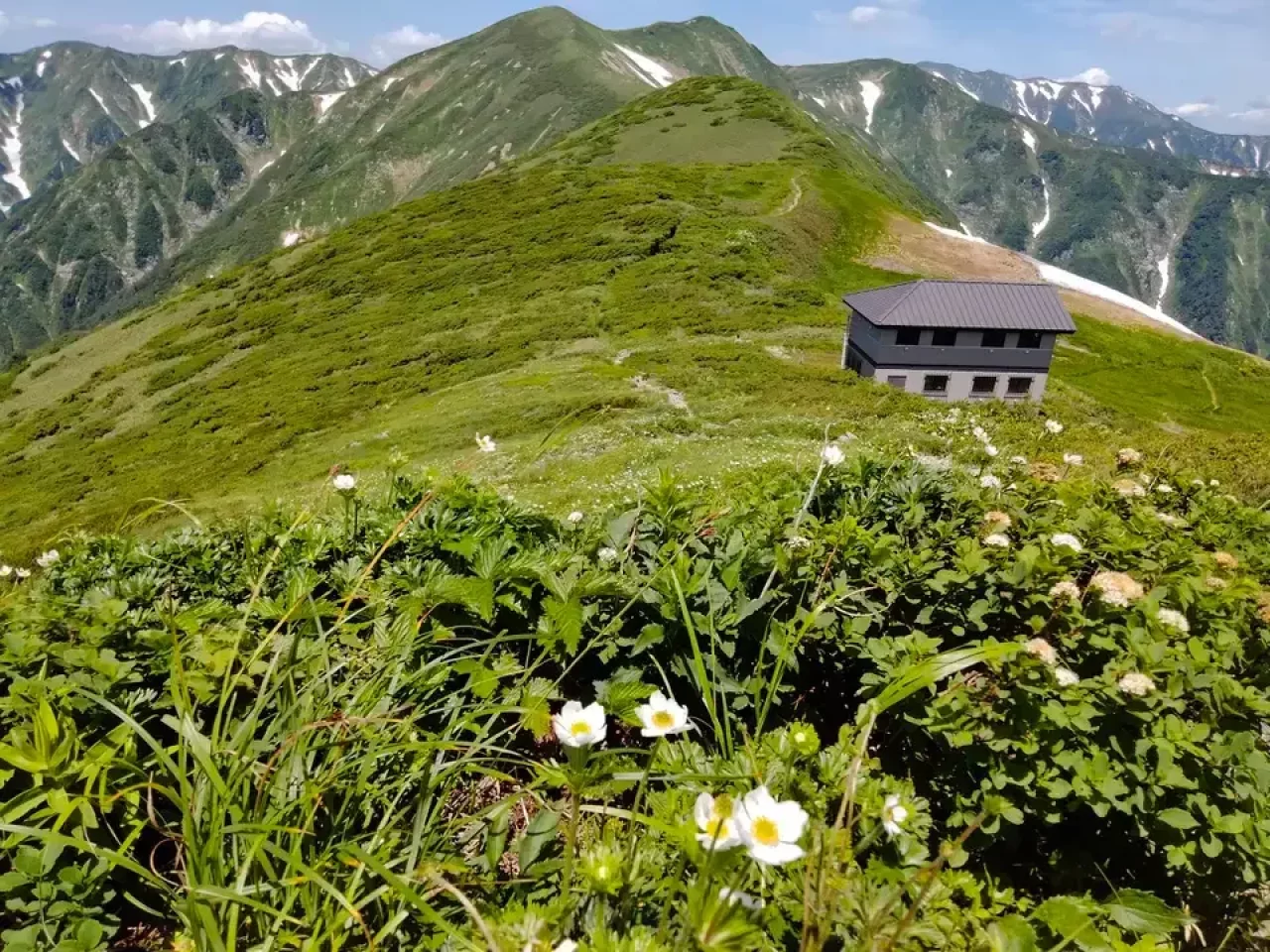 竜門小屋。このあたりもチングルマやハクサンイチゲなど、かわいい花がたくさん咲いているお花畑です。