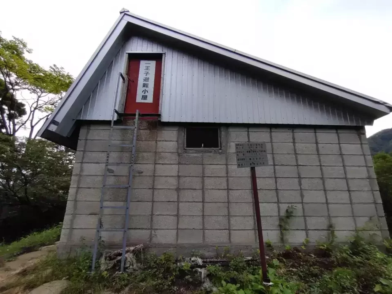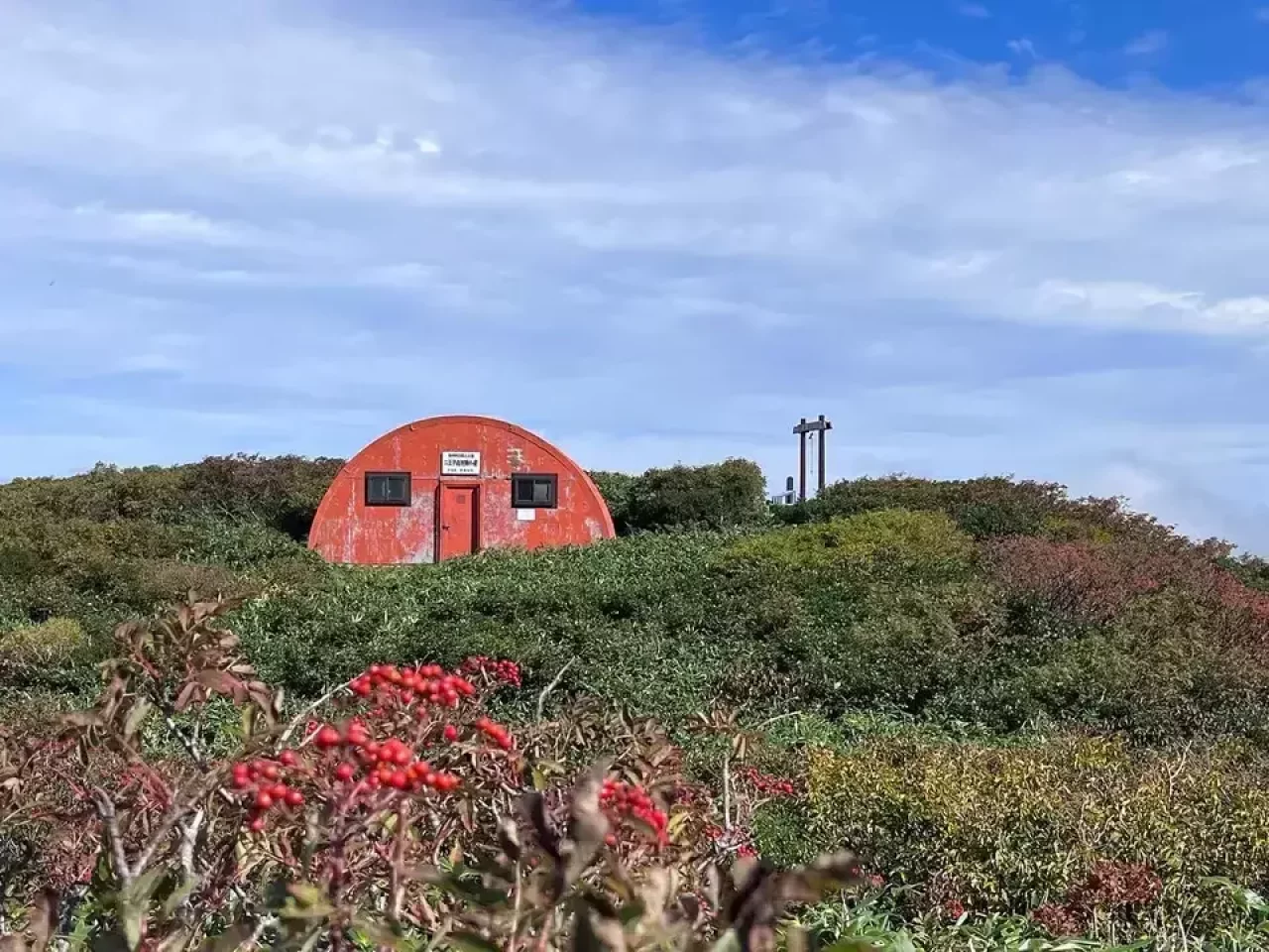 オレンジ色でかまぼこ型の避難小屋が見えてきます。そして小屋の右脇から山頂広場へ。