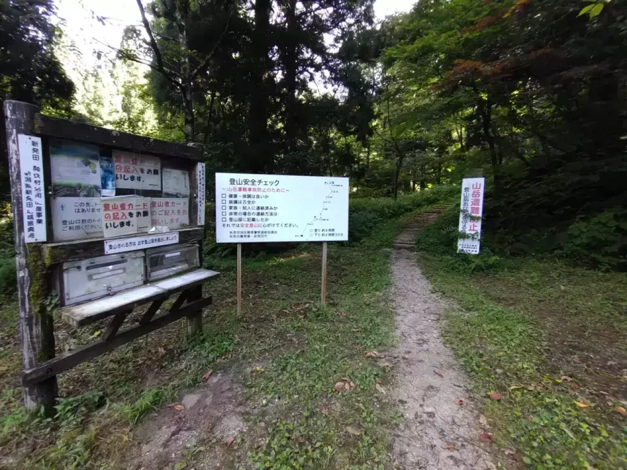 麓の奥宮の前からが登山道です。距離が長いだけで厳しい山ではないですがクルマがないなら基本日帰りは厳しいです。神社前のキャンプ場か避難小屋での宿泊を前提に考えたほうが無難。基本的には車で行くのが前提の山であり、ここに限らず新潟の山はだいたいそうです。行くのならタクシーかレンタカー利用を勧めます。奥宮に登山者用の駐車場がありますが昼前には9割くらい埋まっていることが多いです。