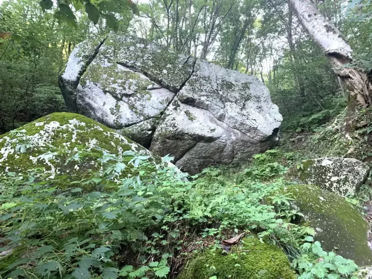 大きめの石がゴロゴロ出てきます。石に張り付いた葉っぱは滑りやすいですから気を付けましょう。登山口から約40分にある神子石、天然シェルターです。するともうすぐ二合目になります。