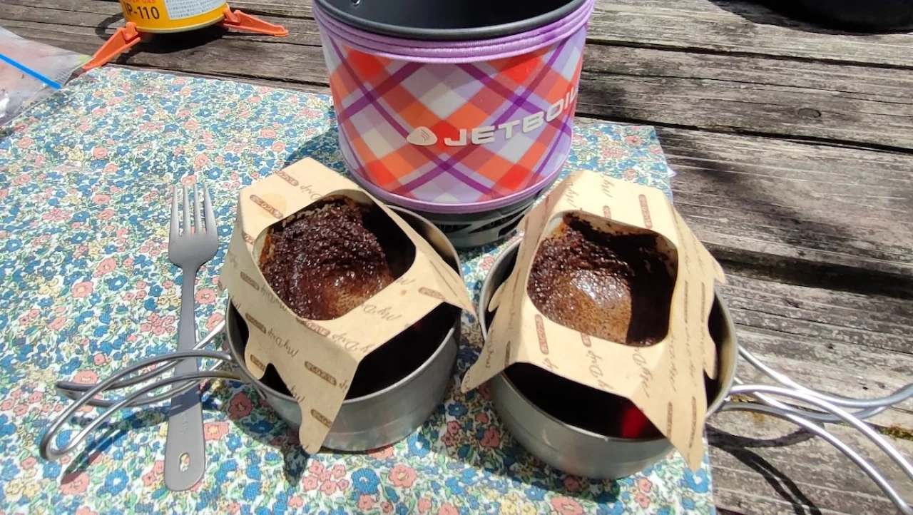 クッカーは当然綺麗なので食後にお湯を沸かしてコーヒーもすぐにいれることができました。これはダイソーのコーヒーフィルターを使っています。使い終わった後もパスタを食べたジップロックに入れてペタンと畳んでしまえばごみはコンパクトになります。