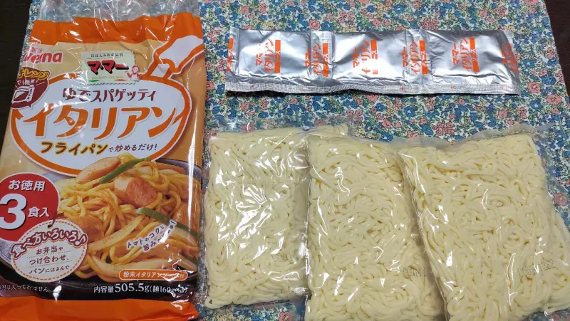 既にゆでてあるパスタが3食分と、粉末ソースが同じく3食分入っています。