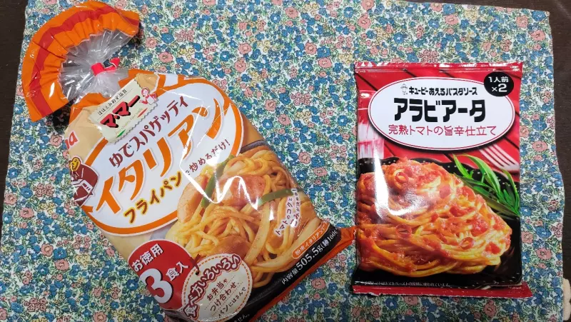 かわりに「キユーピー あえるパスタソース」のシリーズ、「アラビアータ 完熟トマトの旨辛仕立て(1人前x2食入り)」を使いました。