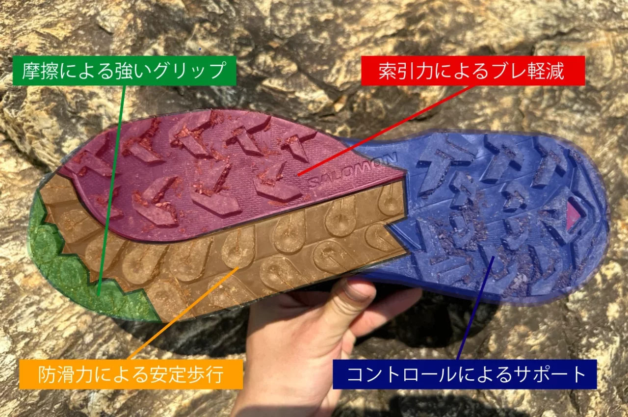 まず緑色の「摩擦による強いグリップ」と記載されたつま先部分ですが、ここには特徴的な丸いラグパターンが採用され、吸盤のように石や木の表面に吸い付くようにグリップを効かせます。そして吸盤のような丸いラグパターンと切り込みの入ったパターンによって強い摩擦力を備えています。これは岩のわずかなスタンスで体重をかけて滑りづらい実感がありました。しかしながら雨の日や朝露などが多い時間帯の山歩きでは滑ることがあるので全てをシューズに頼るということは避けるようにしましょう。