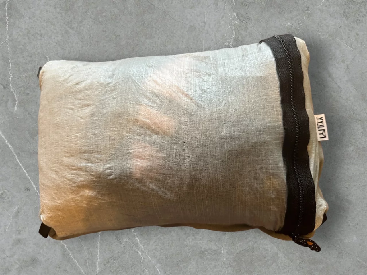 リバーシブルピローは商品名にもあるように裏返すとそして使用できる優れものです。素材はダイニーマなので、雨や汗に中のものが濡れづらく、また枕として使用する時には着用していたフェア類をこのスタッフバッグの中に入れるのですが、通気、透湿しないダイニーマなので、匂いも気になりません。