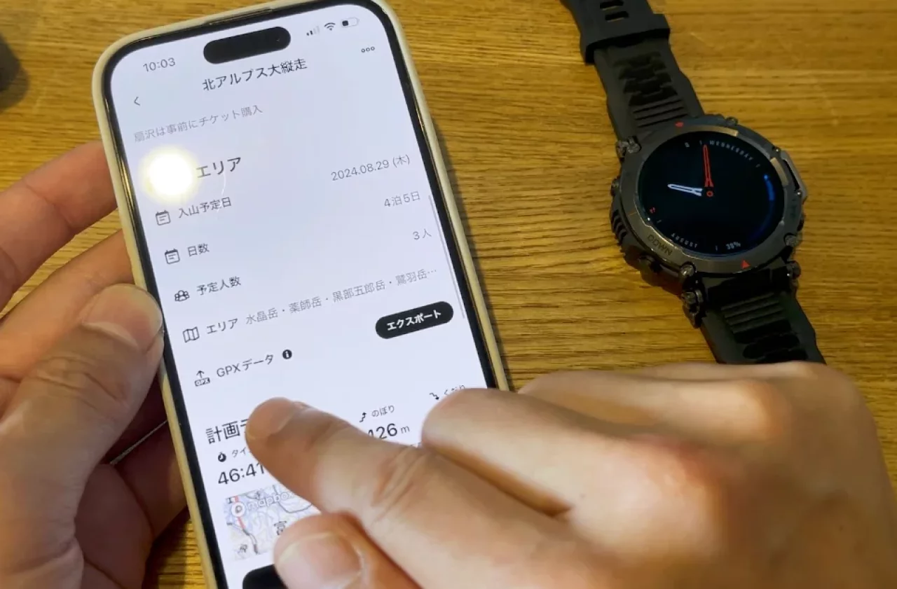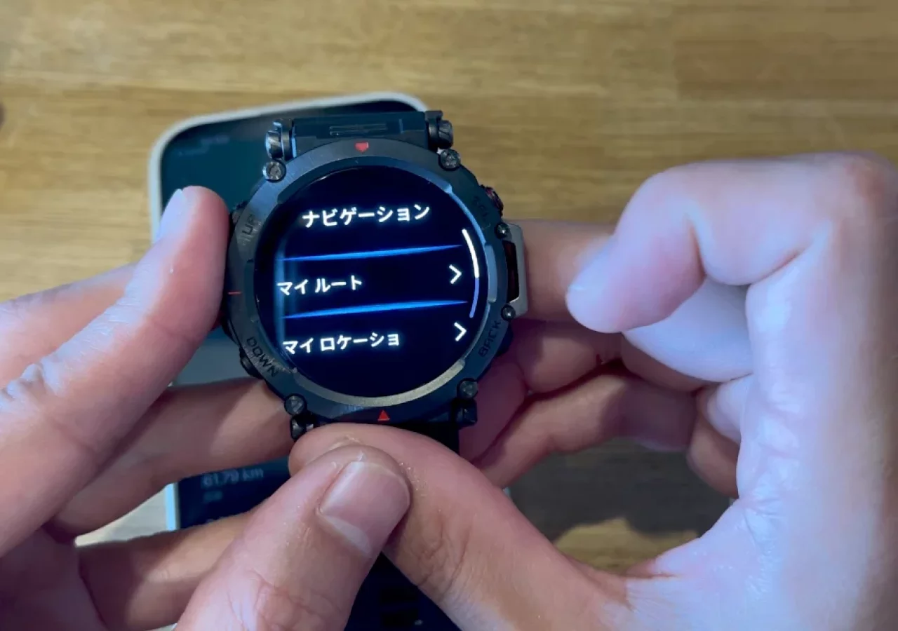 登山アプリで作った自分の登山計画を、Amazfitのアプリに送って、そのデータを時計に転送すれば簡単にナビゲーションしてもらうことができます。「簡単に!」しかも「非常に見やすい」というのがミソで、等高線のついたマップで現在地を確認できるのは、素晴らしい機能です。
