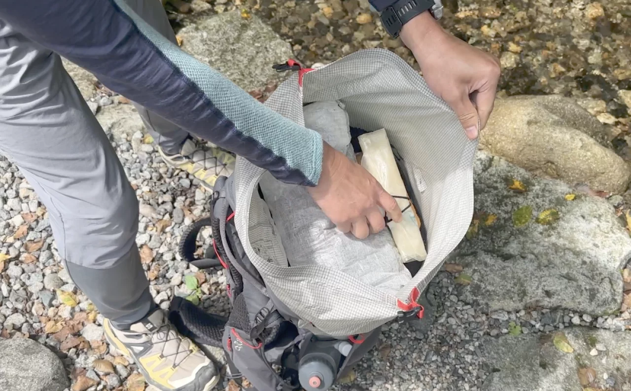 フロントポケットにはレインウェア、ウインドブレーカー、ミドルレイヤーなどをパッカブルせずそのまま突っ込むように収納しておけます。
