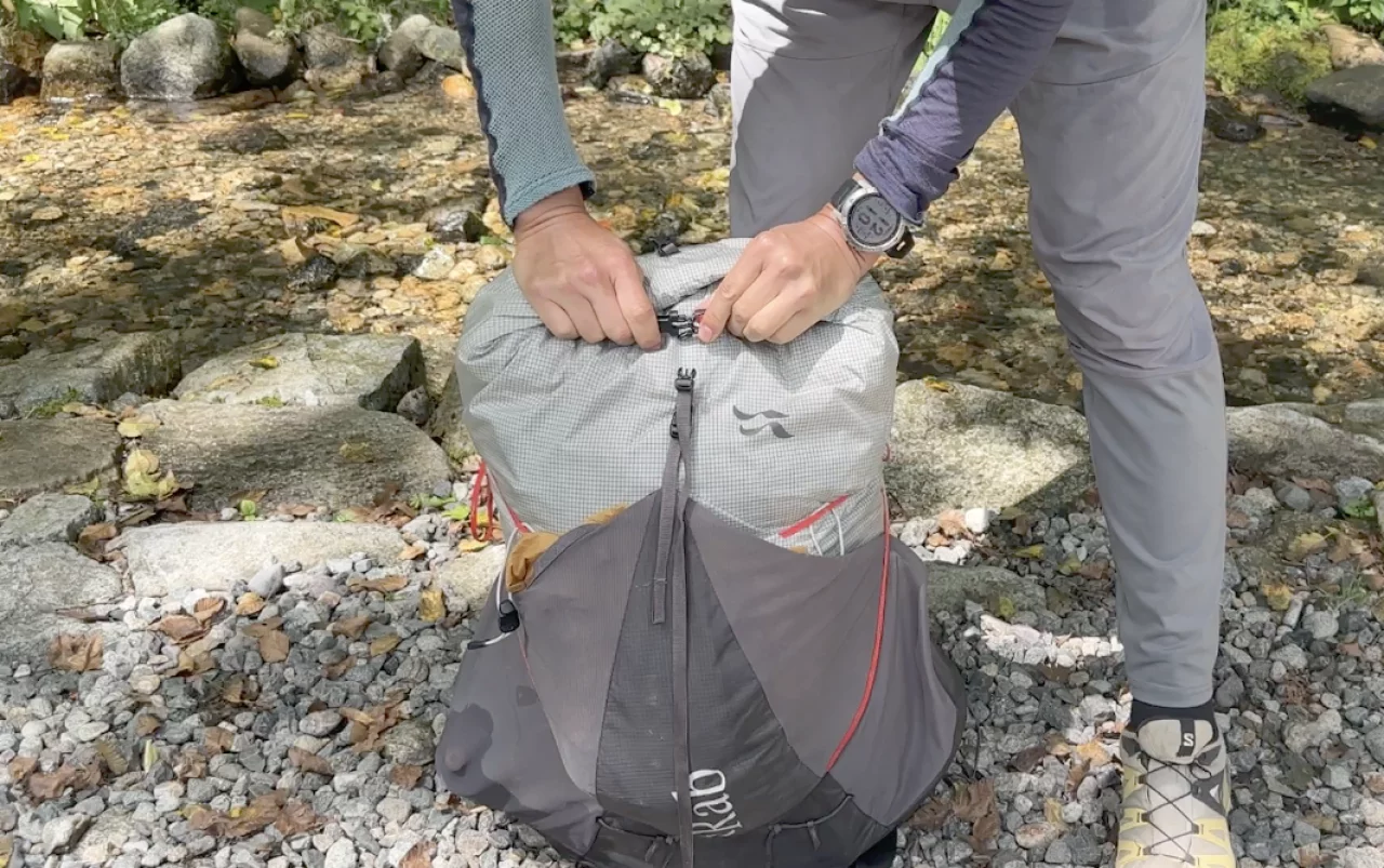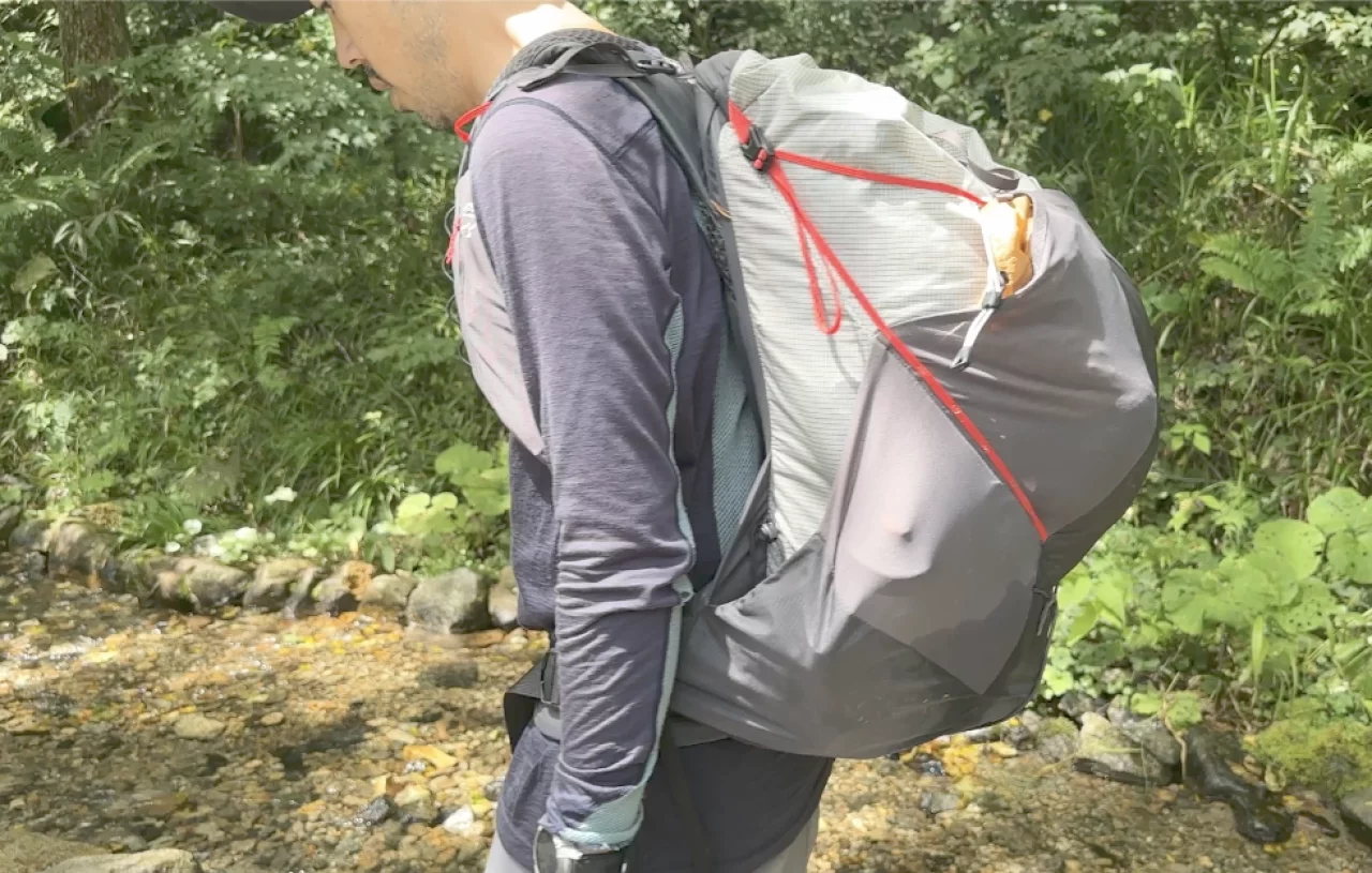 このザックはトップ部分がコンプレッションを兼ね備えたロールトップで、装備容量が少なくともザックの中に空間ができづらく、それによって荷物がザックの中で揺れずに安定した歩行が可能です。