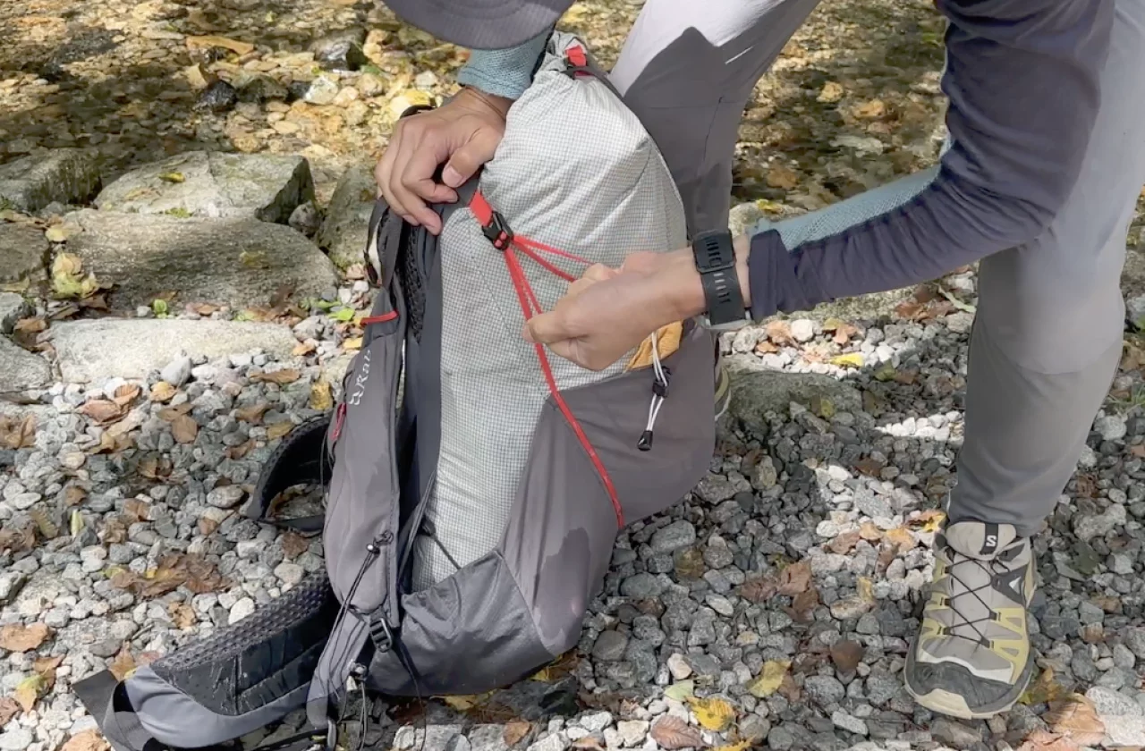 サイドポケットはザックを背負ったままでも手で掴みやすいデザインで、行動食用に準備しておいたスタンドコジーに入れたアルファ米や水筒を収納しておけます。