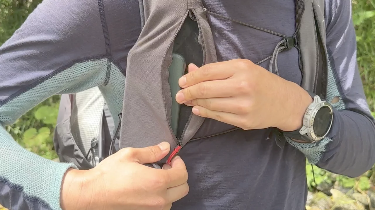 ショルダーに取り付けられたポケットにはスマホ、行動食など収納しておきます。