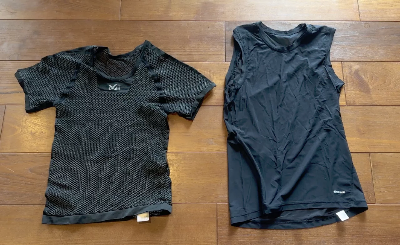 メッシュレイヤーは2種類を使い分けていて、暑い季節はファイントラックのドライレイヤー、少し肌寒く感じる季節はミレーのドライナミックメッシュを選んでいます。2つを比較するとドライナミックメッシュの方がメッシュに厚みがある分、保温力が高いように思います。