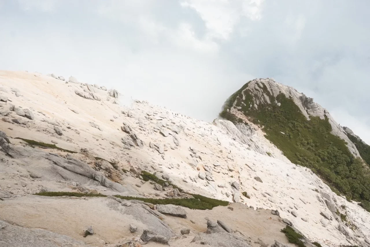 ぬるりと登頂したので、一応やなさんも呼んで登頂したぜ的な動画を撮ってさっさと次の山頂?に向かった。やなさんはやなさんで多分登頂してから少し時間が経っているので感情が落ち着いているし、私らは私らで東駒ヶ岳に騙されたりのぬるり登頂だったからよくわからない感情になっていて、あとちょうど曇ってきたのもあって、そんなに景色を楽しむことなくささっと降りた。