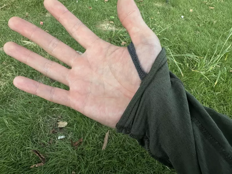 袖口部分には簡易的なサムホールがついており、手首を覆い隠すことができる以外に、この上からミドルレイヤーを着用する時に袖が捲り上がりづらい特徴があります。