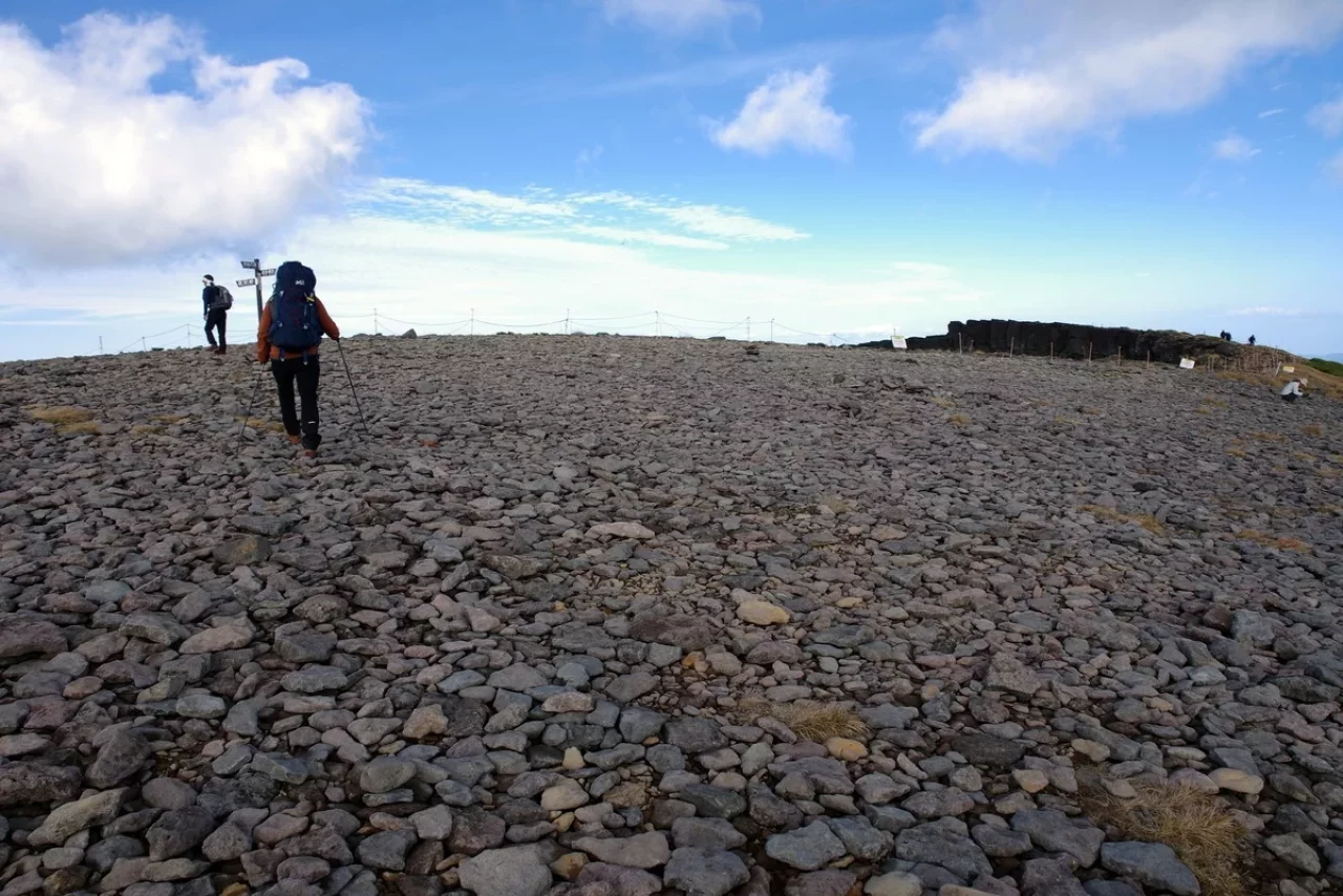 硫黄岳の山頂は広々とした平坦な地形が特徴で、まるで大自然の展望台のように360度のパノラマビュー。北側に広がる断崖絶壁は、まるで大地が裂けたかのような壮大な景観を見せ、自然の力強さを感じます。この絶景と絶壁のコントラストが、硫黄岳の山頂を特別な場所にしています。