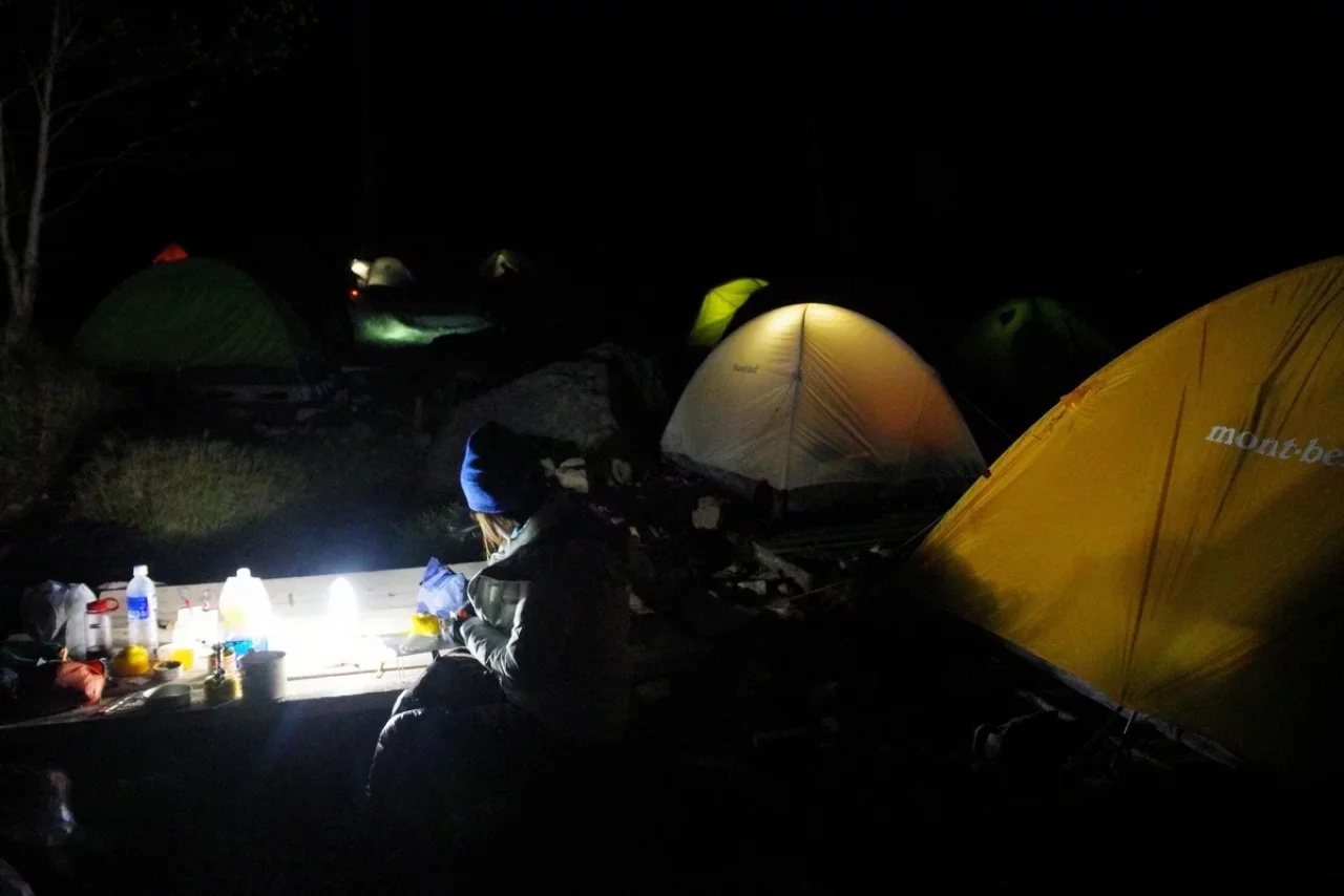 撮影が終わると次は山飯の準備。なにしろメーカー関係者の人なのでランタンには困らない、軽量な明かりはいくつでも持ってこれます、私たちのサイトはまるでイカ釣り漁船の様相。それがULか?って言う突っ込みは無しで。