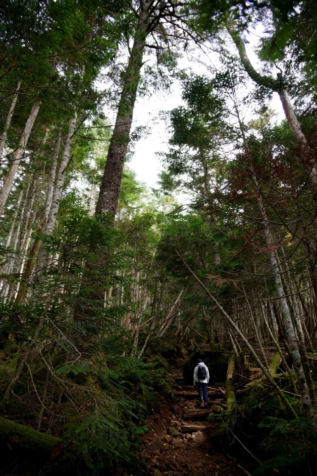 9時に出発、オーレン小屋までの道中、美しい森林が広がり、渓流のせせらぎが心地よく、苔むした岩や木々が幻想的な雰囲気を。ただ、この時期はまだ黄葉には早く、この辺りの紅葉のピークはもう少し先です。