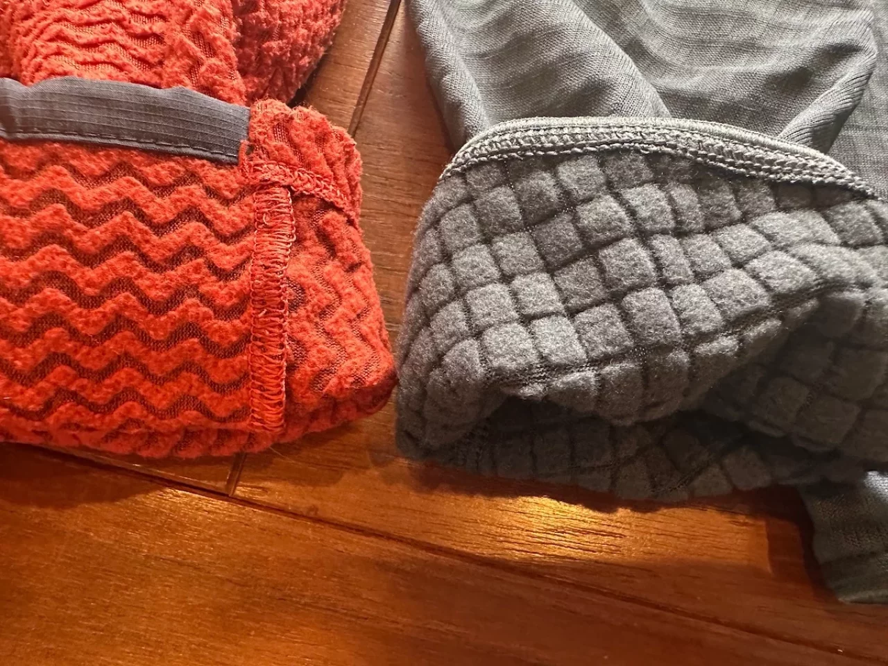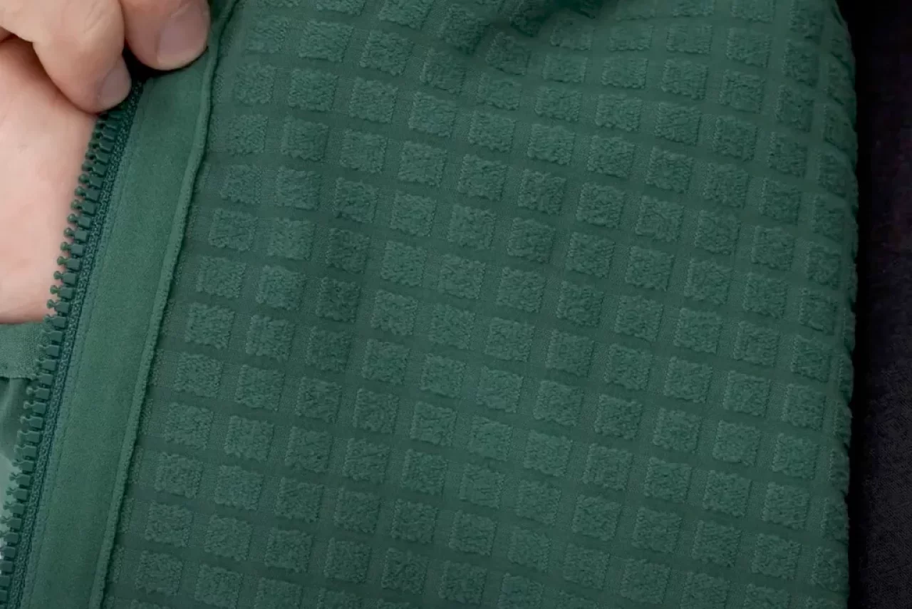 R1サーマルは4種類のモデルの中では最もこの凹凸の目が細かく商品紹介ではマイクログリッド・フリースの裏打ち付きと紹介されています。いわゆる凹んだメッシュ部分の面積が少ないので、その分保温力に優れたフリースです。