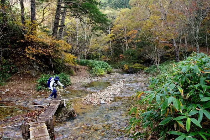 まだほとんどスタート地点なので、あまり見とれてる訳にはいきません。そこからハンノキ沢を渡渉します。この辺りは渓流と紅葉の彩が気持よい場所です。