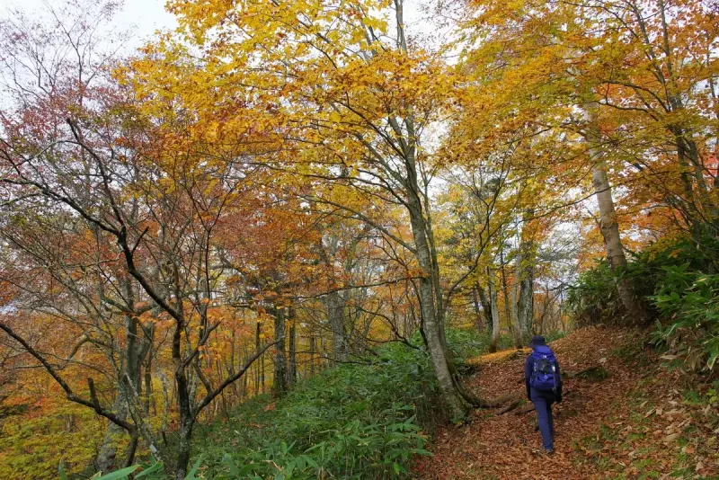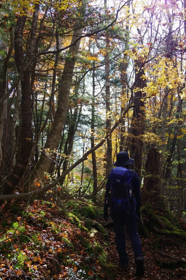 10月16日、湖畔の白樺は落葉し、紅葉への期待値は低かったのですが、登山道入り口から程なくして見事な紅葉の中に身を置くこととなります。