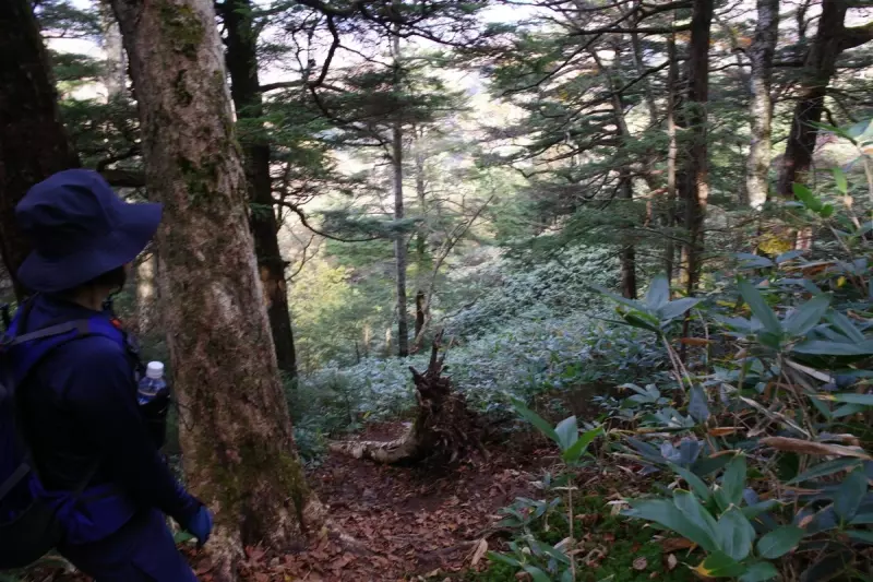 地蔵峠を越えると植生は針葉樹主体となり、見晴らし無いので景色は退屈。けっこうな急登ですが小さな登り返しも多くイラっとします。