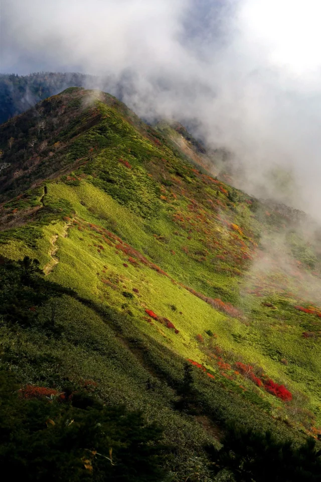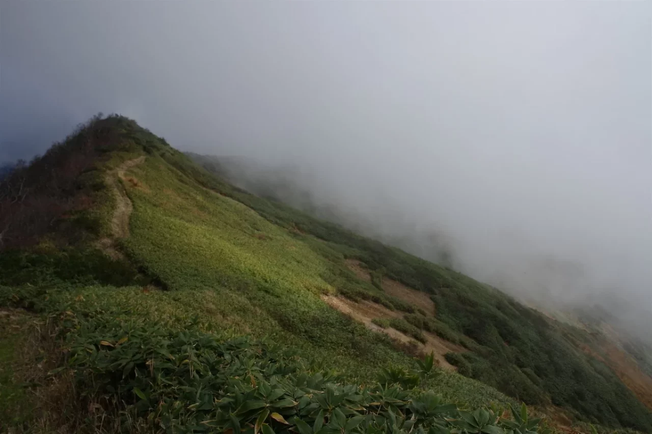登ること2時間半、変化の無い景色に飽きてきた頃、堂岩山山頂に到着ですが視界は無く、パートナーと「ここはツマラナイ山だねー」などと会話しますがそこからチョット先が凄かった!