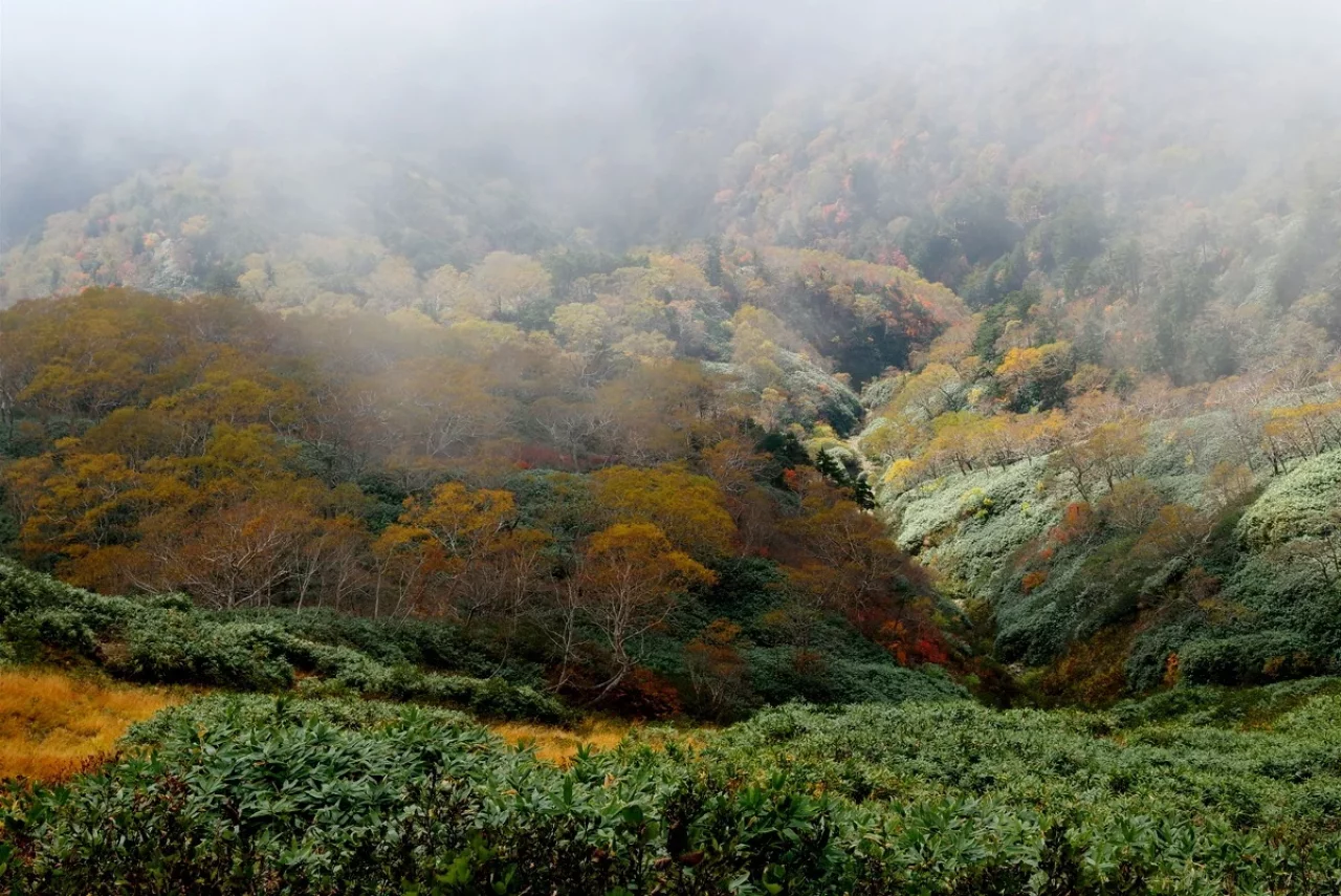 でも、進むたびに景色はより美しく。この日は遷ろう霧の合間を射す光と黄葉とのコントラストが素晴らしい絵にしてくれました。