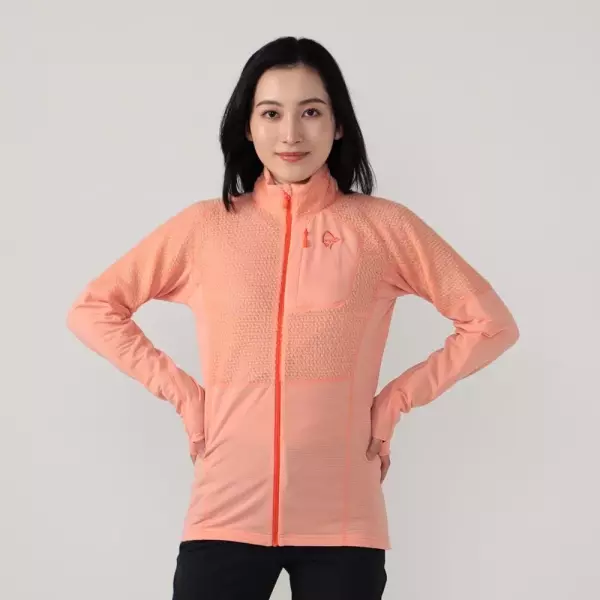 ノルウェーのアウトドアブランド、ノローナのリンゲン アルファ90は、業界最軽量の薄手フリースです。毛足が長く「質量が少ない」というのが最大の特徴である高機能素材ポーラテックのアルファ90ダイレクトを胸周りに使用し、驚くほど軽量でありながらも保温性を確保。また、汗をかきやすい脇や袖、腹部には、同じく高機能素材であるポーラテックのパワードライを使用することで通気性、速乾性を実現しています。