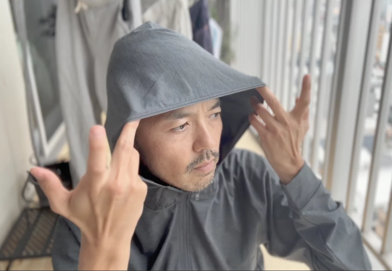 フードはジッパーを閉めた状態でも被る、取るが可能で、ピタッとフィットしすぎず、さらにストレッチをするのでフードをかぶったまま右に左に首を振っても突っ張り感がありません。そしてフードの周りにはストレッチバンドが備わっていてキャップをした上からかぶっても程よくストレッチをして、風が吹いてもフードが頭から取れづらいデザインです。