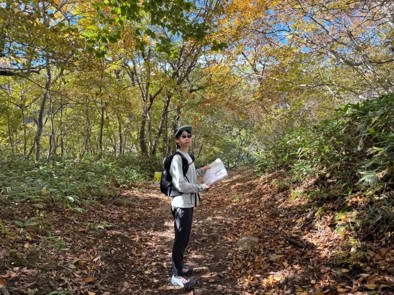 山岳エリアに向かう道は、こぼれそうなほどの秋の道だった。黄色く色づいた葉に囲まれているだけでなく、すでに落ち葉で足元が埋め尽くされていて、歩くとシャクシャクとあの独特の音がした。自分の足音をASMRのように聞きながら、いつの間にこんなに秋になったんだと驚く。昨日まで30度とか言ってたけどね。