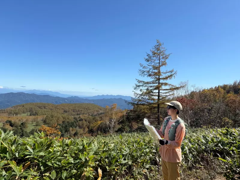 標高が上がってくると、「芳が平」と名のつく理由がわかる場所にでた。広い広い笹平と、その奥に見える黄金のダケカンバ?の林。ところどころ色づいた赤やオレンジが、絵に描きたくなるような、これこそまさに秋の景色。雲が一つもなく、常に注がれる太陽の光と吹く風が心地よく抜けて、天に溶けてしまいそうなほど心地が良い。