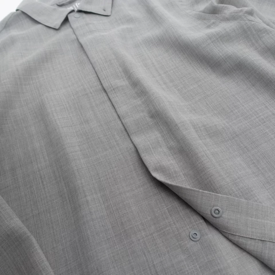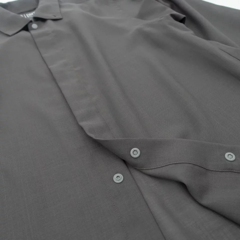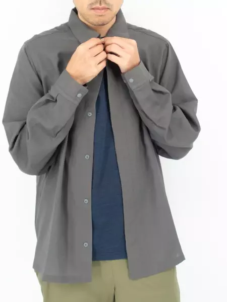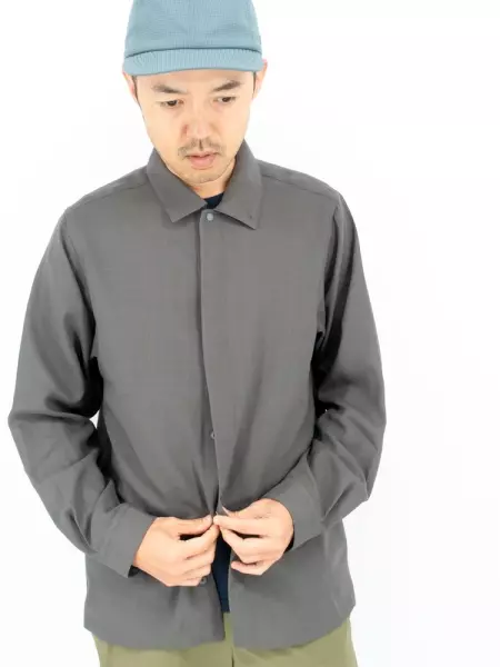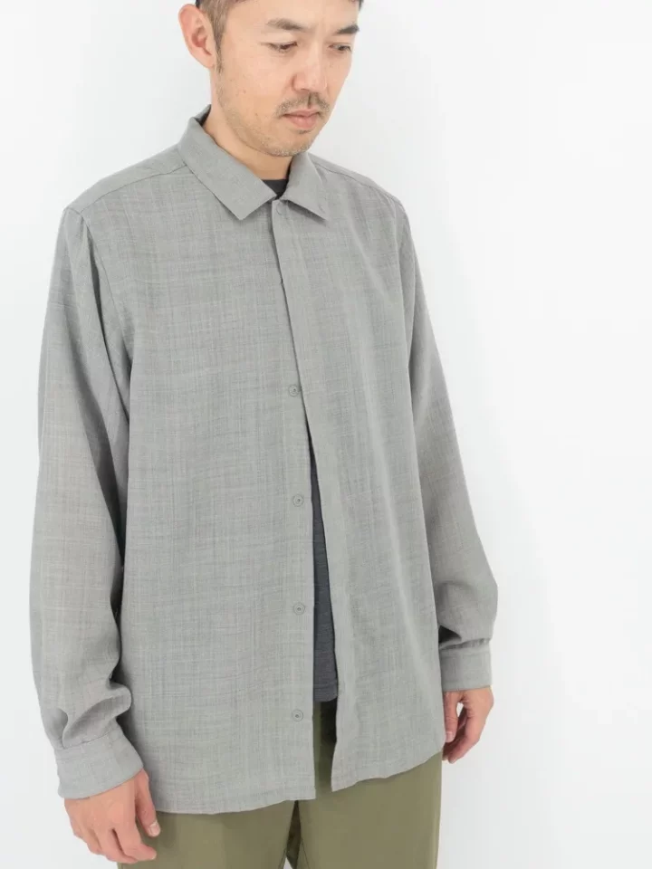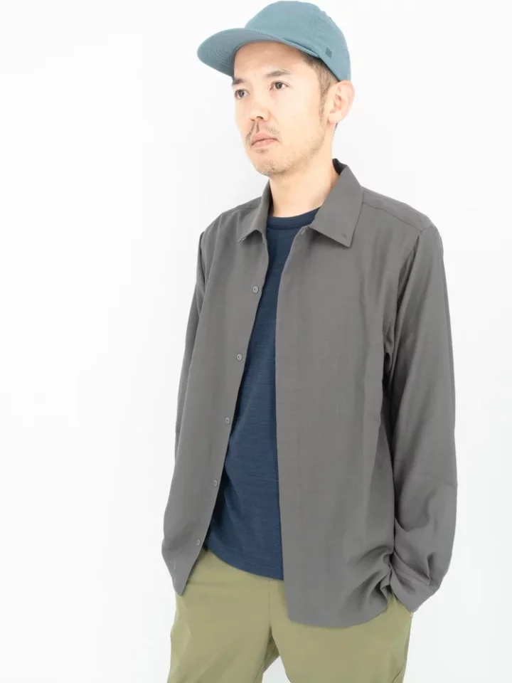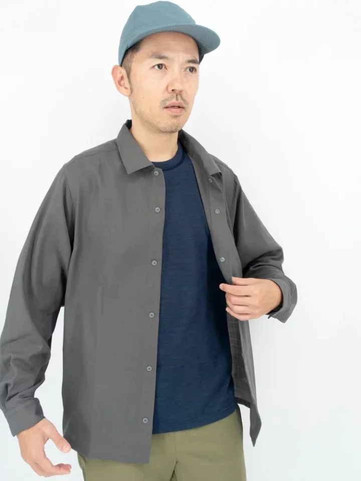 同じ素材を使用したショートスリーブ・シャツが2024年春夏からスタートしていますが、ロングスリーブでは新たにスレートグレーというカラーを追加し、さらにロングスリーブだけれどもショートスリーブのような上半身の動きやすさを追求したパターンと軽量性に特徴を持たせたデザインに仕上がっています。