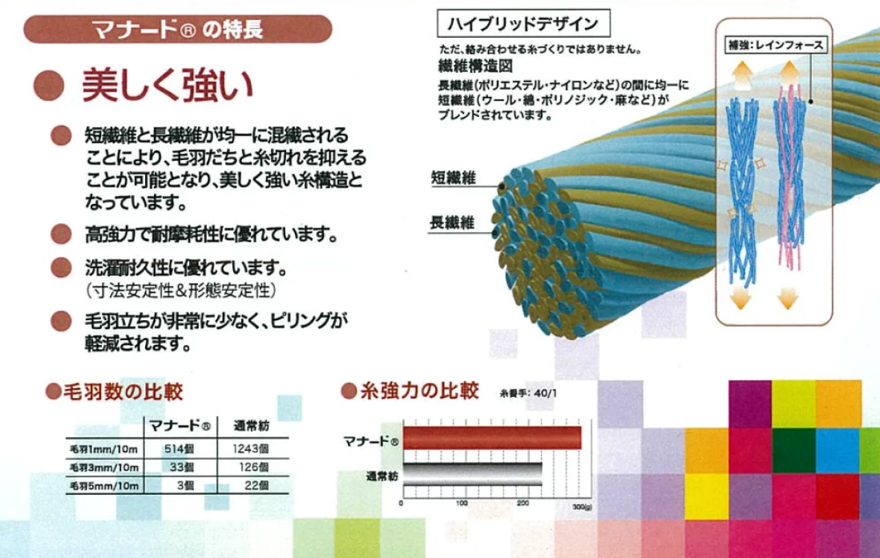 ウールの糸は、細くなればなる程糸切れを起こしたり、毛羽が目立ったりしやすいのですが、均一複合のマナードは、長短繊維が均一に混繊されているので美しく強い糸構造となっています。