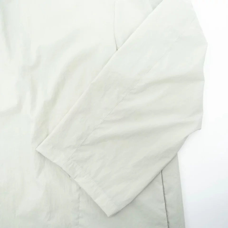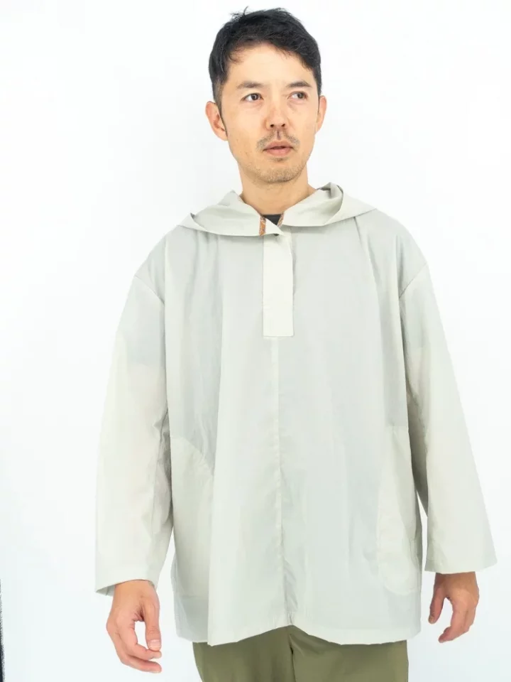 生地の重量を確認する際、㎡あたりの重量をチェックするのですが、旅HOODIEで使用している生地は85g/㎡です。おおよそ60g/㎡の素材で約100gのウインドブレーカーを作ることができるとして考えると、非常に軽量な生地を使用していることがわかると思います。ポリウレタンが混紡されたストレッチ性のある素材の多くが重くなりがちなのに対して、非常に軽量で、上品な光沢感のある素材を使用しています。