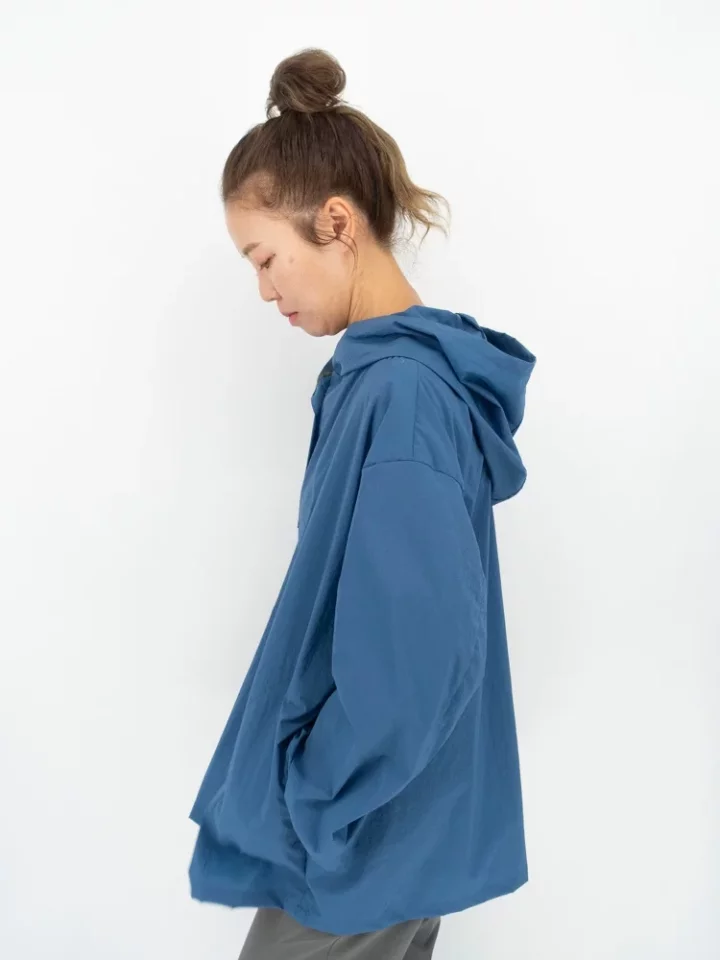 中に厚手のフリースやダウンジャケットを着用してもガバッと着用できて保温力を高められたり、薄手のベースレイヤーの上からウインドブレーカー代わりに着用しても暑くなりすぎず気持ちよく歩けたり、オールシーズン様々な着用方法を楽しむことができる、そんな道具のようなHOODIEです。