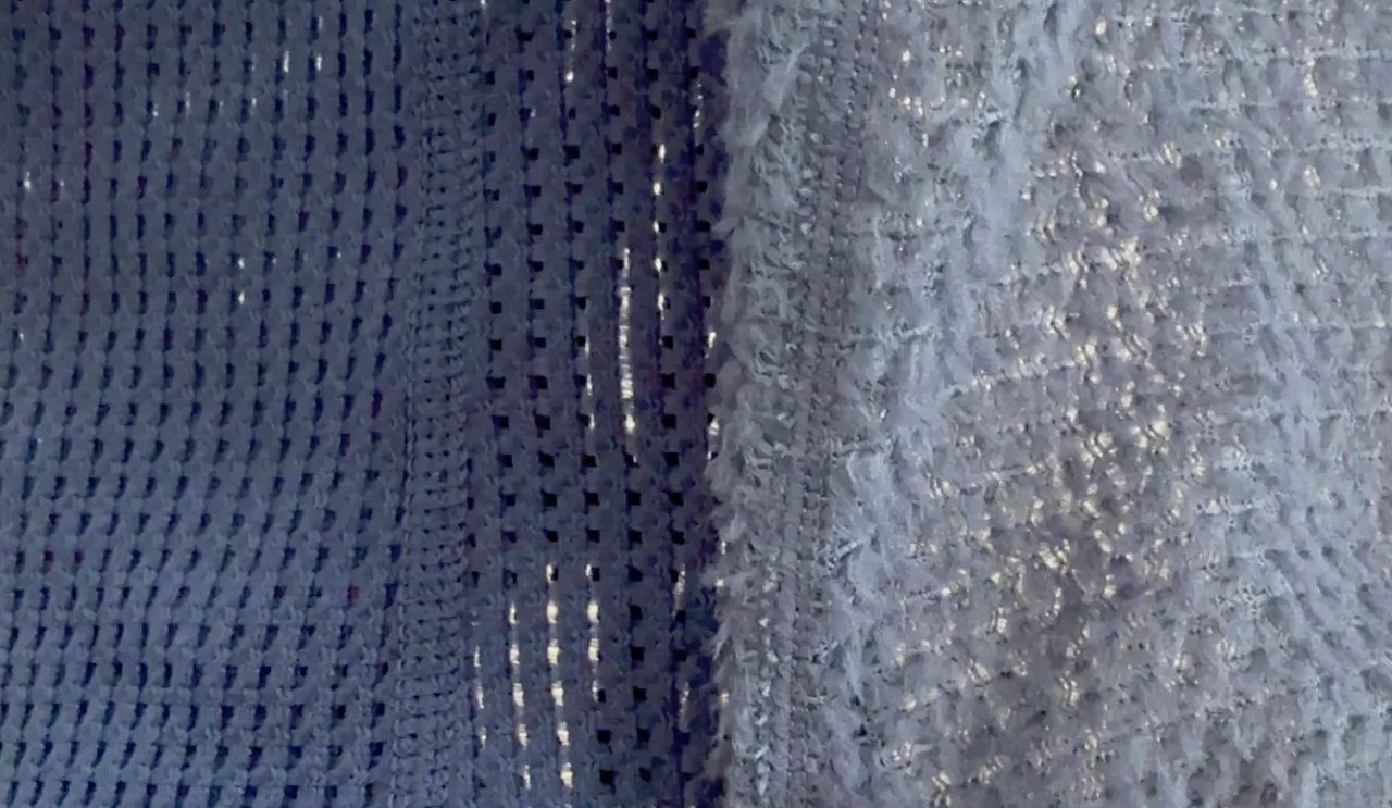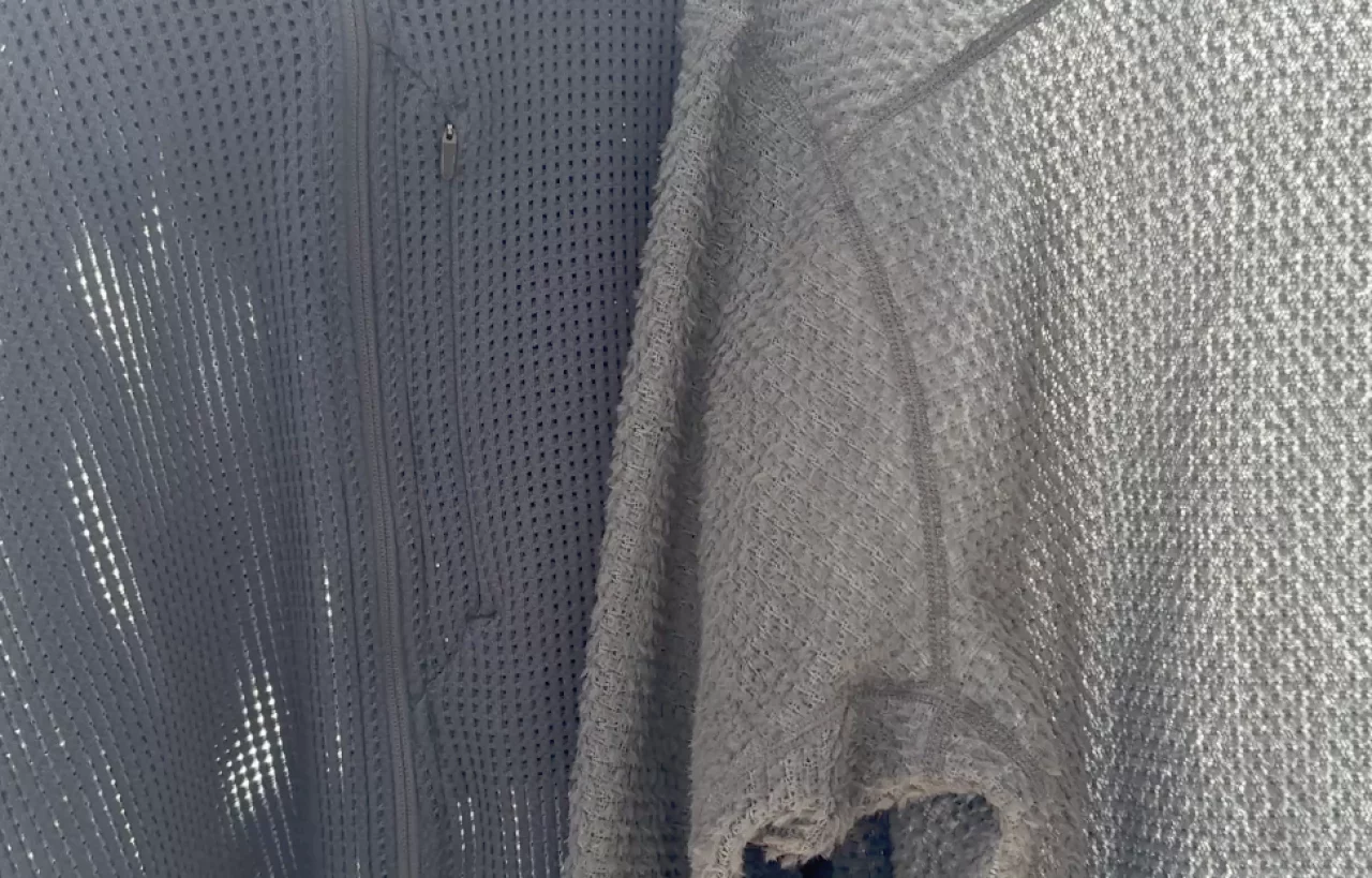 パワードライを拡大してみてみると凹凸が備わった編み地で、光に透かしてみると粗いメッシュ生地になっていることがわかります。そしてこのメッシュ素材はロフトがあるため、上からシェルジャケットを着用するとしっかりとデッドエアーが保持され体を温かくすることができます。