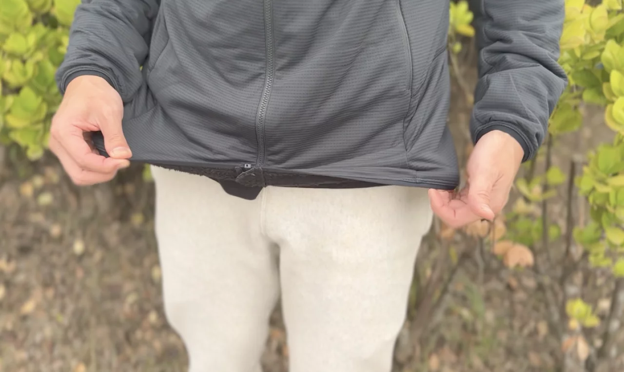 後ろ中心丈が74cmで、僕が愛用しているアークテリクスのカイヤナイトジャケットがMサイズで65cmなので、少し長めです。これは腰やお腹を冷やしづらく保温を目的としたミドルレイヤーと考えると理にかなったシルエットだと思います。