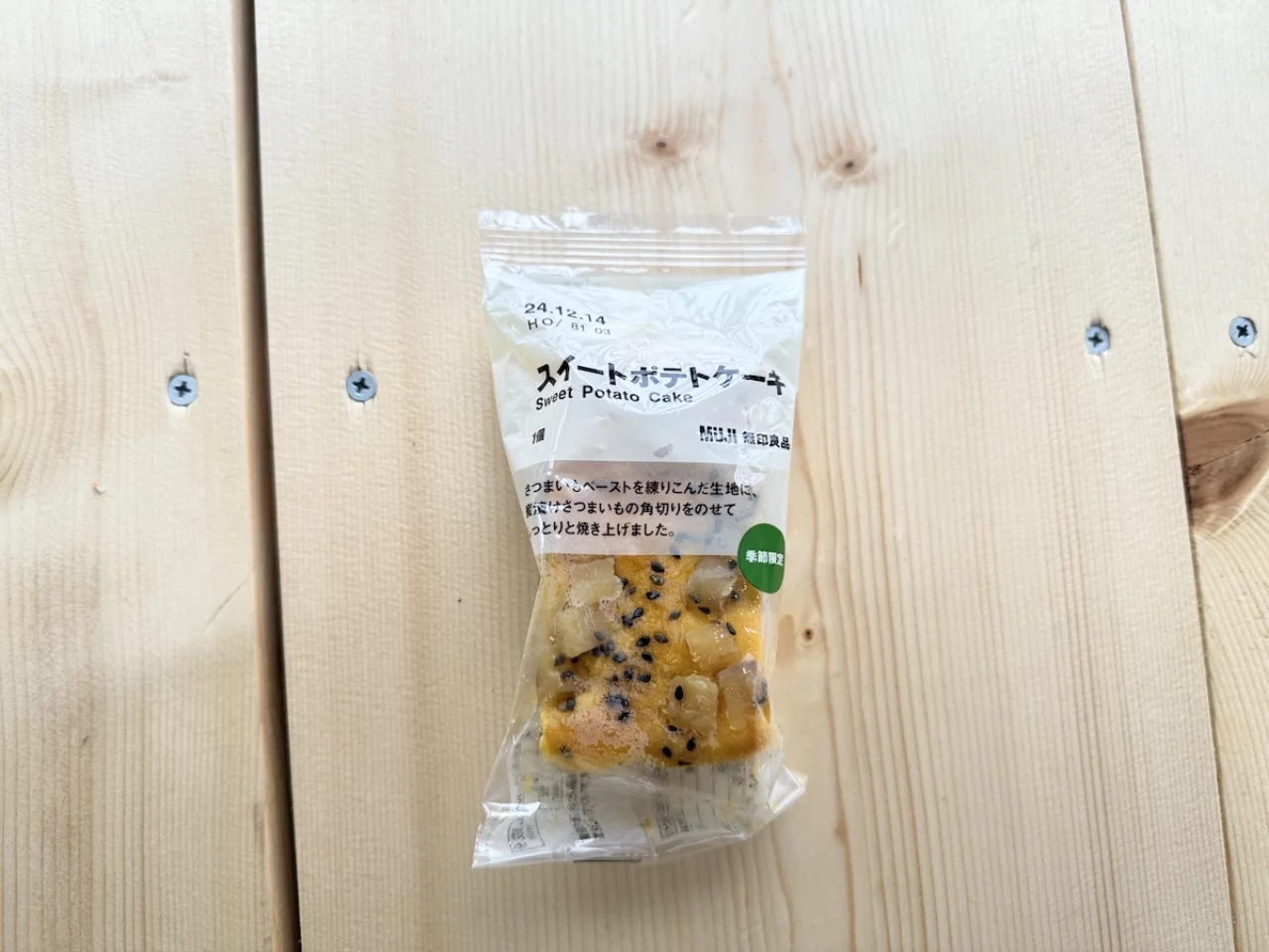 以前の「無印で揃える登山好きにお勧めのアイテム5選」で紹介した「しっとり&高カロリーのバウム」と同じ位置づけで最近好んで食べているのが、スイートポテトケーキです。袋に紹介文があります。これを読み上げますと「さつまいもペーストを練り込んだ生地に、蜜漬けさつまいもの角切りを乗せてしっとりと焼き上げました。」とありますが、想像通りの味わいで、コーヒーにめちゃくちゃ合います。