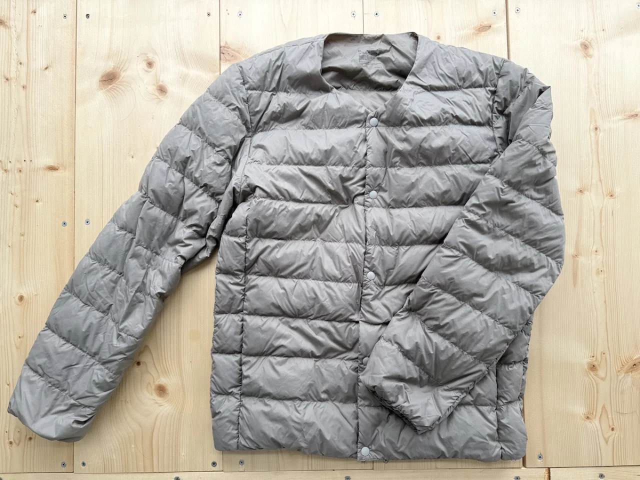 最後は食品ではなくウェアの紹介です。無印良品の最軽量ダウンジャケットに位置付けられるこちらは、商品名からもわかるように襟がないノーカラーです。さらにフロントはファスナーではなくスナップボタンで、非常に軽いけれどもアウターとして着用するのには登山では不安です。