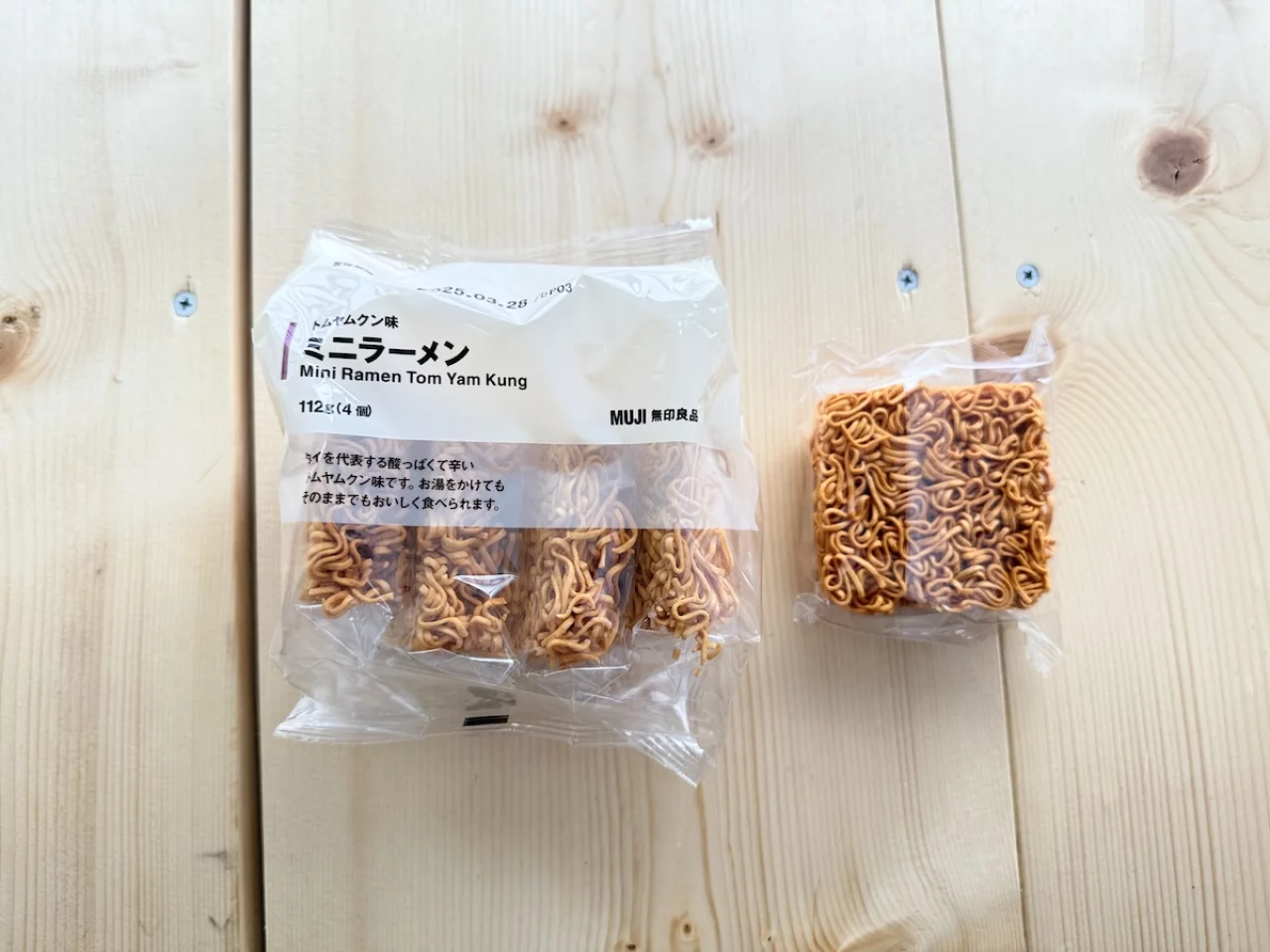 無印良品のミニラーメンはチキン味、キムチ味、トムヤムクン味の3種類があって、約28gで個包装されたラーメンが4袋入っています。例えば「ちょっと小腹が空いたな」と感じた時に熱湯200mlを注いで3分待てば、美味しいラーメンを楽しむことができます。麺自体に味がついているのでそのままボリボリとお菓子のように食べることもできるし、日清カップヌードルのように粉末がないので持ち歩きしやすいのも良い点です。寒い時はキムチ味、トムヤムクン味を食べることが多いです。