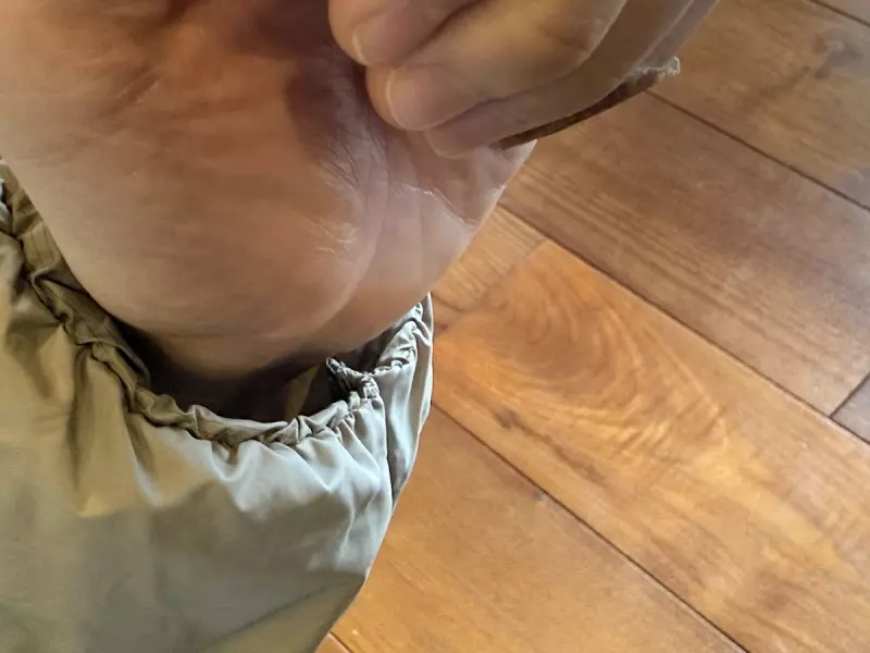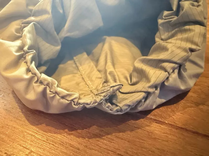 袖口には平型のゴムが内蔵されています。バインディングなどが何もないので、1cmほどの縫い代が手首に当たって少し気持ち悪く感じることがあります。裾はゴムなどは何もないシンプルな構造です。あまり大きなサイズを選ぶと冷気の侵入が気になります。