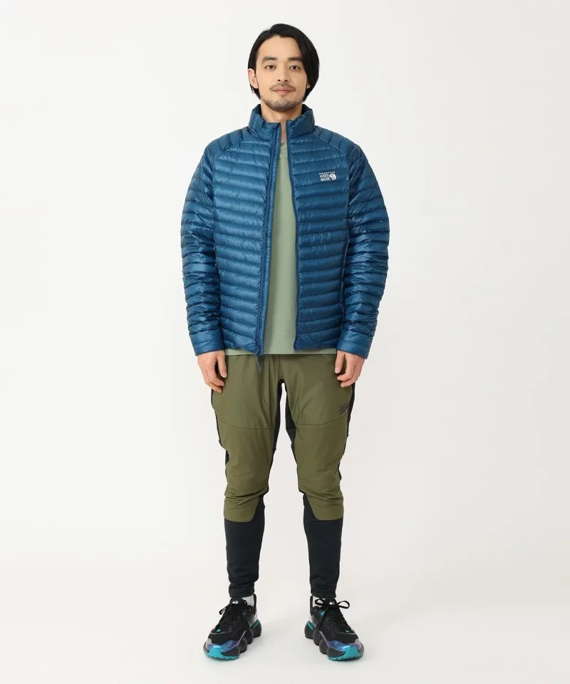 ダウンと化繊を封入したハイブリッドな軽量ダウンジャケットで濡れても温かさを保ち、行動着としても積極的に活用できる、登山者に人気の高いモデルです。表生地はソフトな肌触りで強度があり、撥水加工を施しているため、急な天候変化にも対応します。