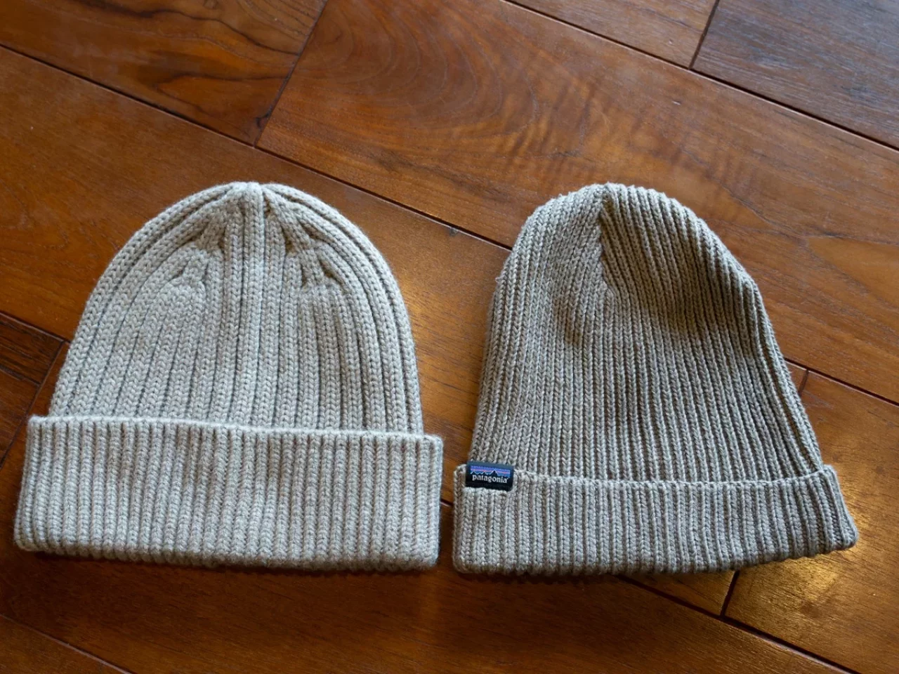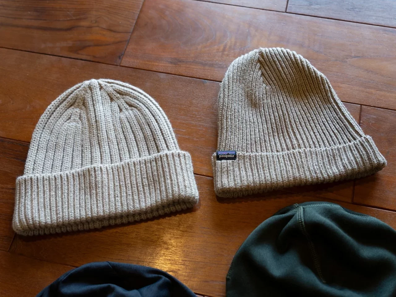 ユニクロとパタゴニアのニット帽はリブ編みで、日常使いにも適したデザインです。ユニクロのヒートテックリブビーニが重量101gなのに対し、パタゴニアのフィッシャーマンズ・ロールド・ビーニーが92gで、どちらもそんなに変わりません。頭にフィットさせた時に重いと感じることはありません